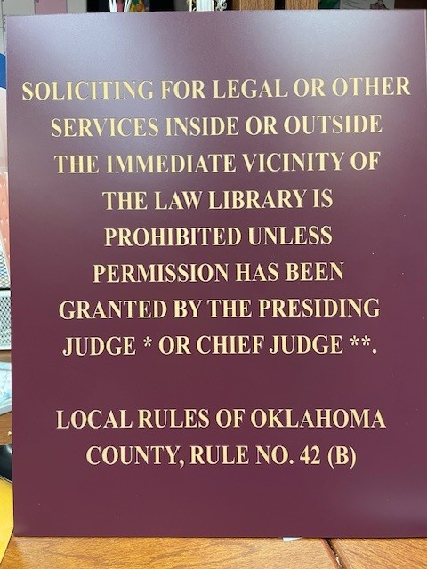 Discussion and possible action regarding the Law Library's request for permission to post public notice of a new local court rule in the hallway outside of the Law Library. This post is to cite Rule No. 42 (B) of the Official Court Rules of the Seventh and Twenty-Sixth Judicial Administrative Districts Comprised of Oklahoma and Canadian Counties. This item requested by Brian Maughan, Commissioner for District Two and Chairman of the Board.